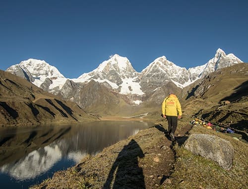 After breakfast, we will begin the ascent towards the Sambunya Pass (4,700 masl), surrounded by impressive peaks such as Jirishanca, Jerupaja and Rasac. After breaking for lunch at the pass, we will descend to our campsite right above the glacial lake Jahuacocha (4,100 masl) with excellent views of Yerupaja Grande, Yerupaja Chico and Jirishanca.